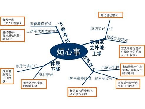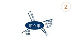 3、从右上角的事件开始,顺时针方向逐个分析每一件事件的表现形式,也就是你认为这个事件烦人的原因(例如你认为“下周考试”是一个造成坏情绪的事件,那它为什么是一个坏的事件呢?有的人并不因考试而担心啊!——因为“你上次没考好”,而“现在有五套模拟题没有完成”。这两个具体的原因给了你“这次考试很烦人”的印象),把每一个具体的原因写在一根分出来的“细枝”上;