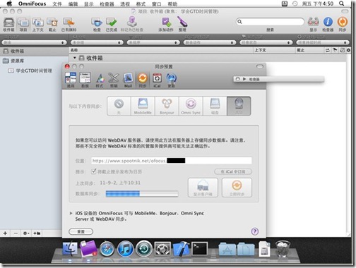 第2个月时,由于做iPhone开发时已经配置好了Mac虚拟机(装的是10.6),就开始用Omnifocus for Mac(装的是1.7.5版本)来进行回顾,这时最重要的同步功能发挥了重要作用,在iPhone上同步之后,再打开Mac同步,所有的内容一个也不少,窗口足够大、输入足够快(装了QQ for Mac输入法),在计划、上下文、回顾等模式下切换也非常方便,只是一开始上手前得耐心地看一遍用户手册,毕竟与Windows上的操作习惯相当不一样。
