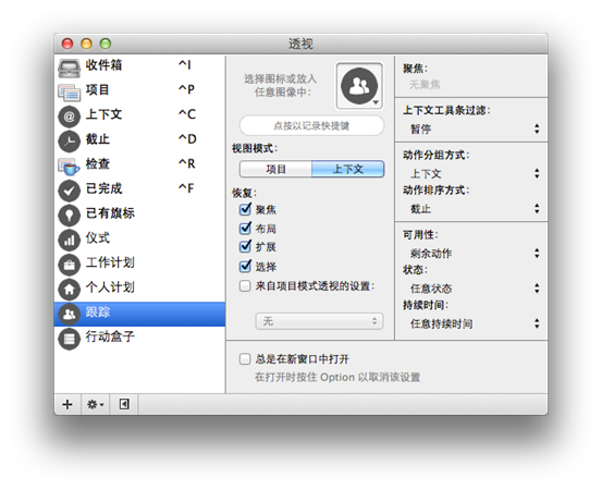 这两个设置的原理相似,我放在一起说。“工作计划”告诉我目前我所能做的所有属于工作范畴内的任务,而那些还未开始的工作,不具备条件的工作,分配给别人的工作以及设置了“暂停”情境的任务将不会包含其中,因此也不会被分散注意力。需要提醒大家的是,这两个透视的视图模式选择的“项目”,因此无法同步到ios平台上。