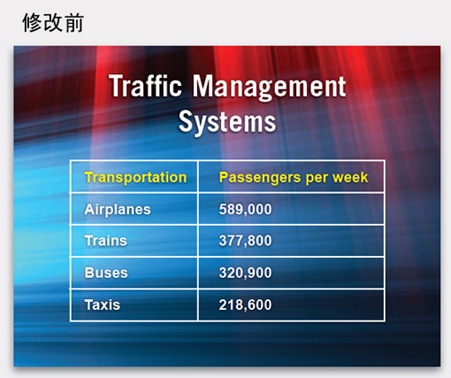飞机、火车、巴士及的士,589000、377800、320900、218600——谁会记得住这些数据?这些数据很有用,但没有人会对这些数据有所反应!我们可以将上述的四组数据分别用四张幻灯片来表达,每一张只表达一个主题,每一张都配合一张与主题相关而且全屏显示的照片。这样才能达到我们上述所说的目的:给观众有足够的空间思考,增加观众对你所说的内容的认同度。