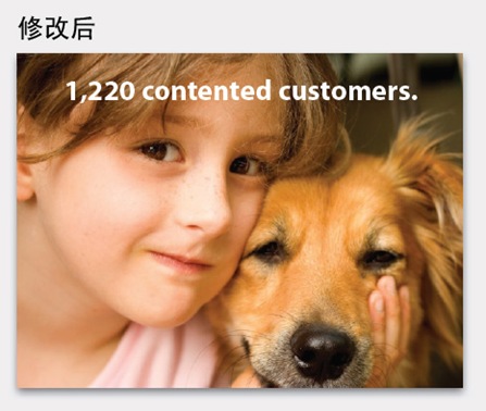 上面这个版面有什么问题?它只是表达了一种事实,再加上数据,仅此而已。在图片中我们没有获得额外的信息。在这个版面中你如果只是想表达被收养的狗只有多少问题还不大,但你并不仅仅想表达出这个信息。另外,活泼鲜艳的卡通狗与深沉渐变色搭配也不配合,进一步使版面弱化。